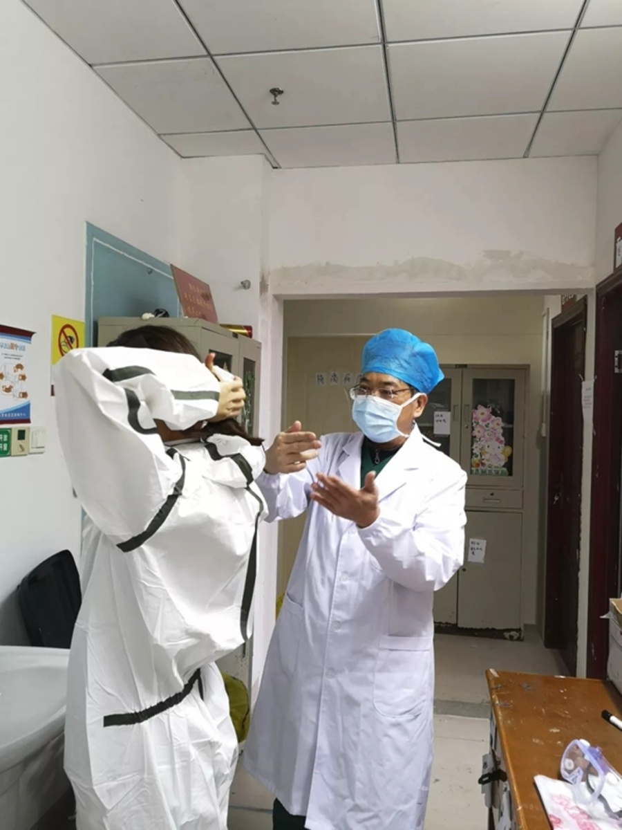 此时,又一批医务人员换上防护装备,进入隔离病房交接班。韦中盛也要跟着进去进行院感督导。他一边穿着防护服,一边指导同仁穿戴防护用具。