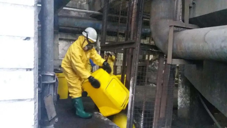 “对于高危医废,我们主要采取回转窑二燃室高温焚烧的方式处理。从各个医疗机构运回的医废周转箱,经过消毒后,由人工一箱箱抬到上料口,再被送入850℃以上的回转窑,再进入1150℃以上的二燃室充分燃烧。燃烧产生的热量用于发电,产生的废气经过净化后达标排放。”