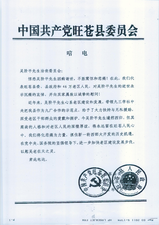 中共旺苍县委、县政府发来唁电