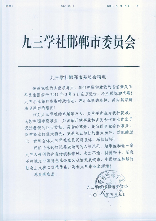 九三学社邯郸市委发来唁电