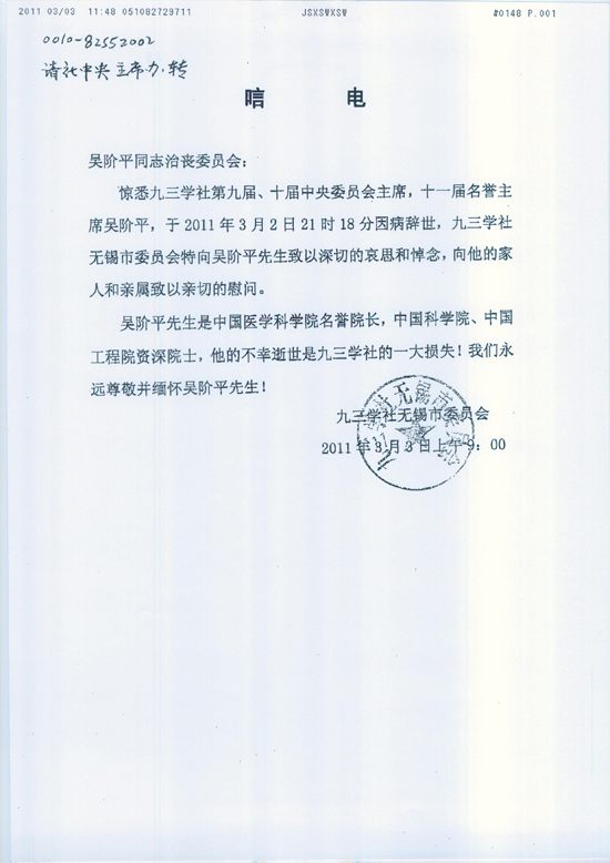 >>专题报道>>沉痛悼念吴阶平同志>>沉痛哀悼