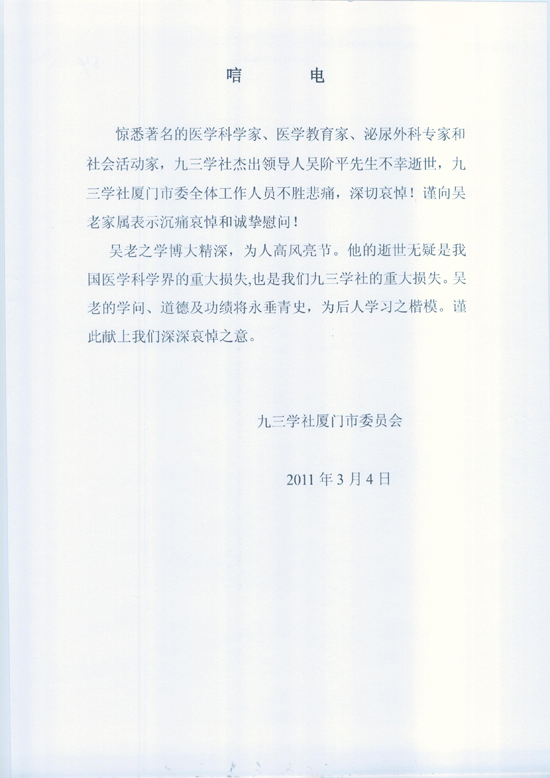 九三学社厦门市委发来唁电