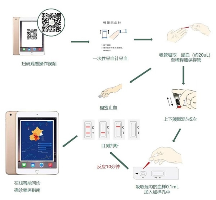 该检测卡适用于血清或指尖血样本,无需专用的前处理设备。使用方便,即采即测,非专业人员经过简单培训后即可自行完成检测。仅需10µl血清或20µl全血,检测时长平均10分钟左右,最短仅需1分钟。